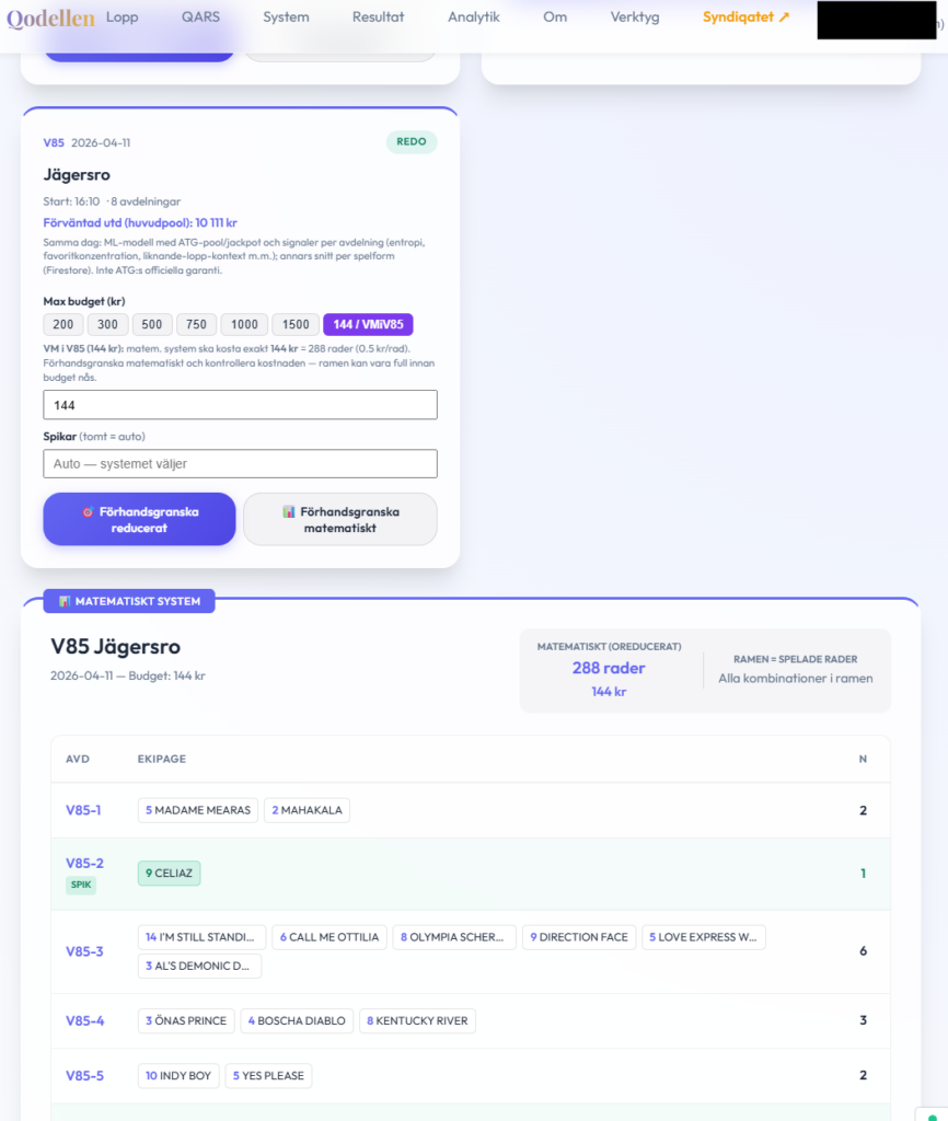 Jag började med att använda den datan jag har, och de prediktioner jag har. Detta är inte perfekt då en del prediktioner är återskapade efter att loppen körts (har numera infört en “låsning” av prediktionerna vid loppets start så man vet förutsättningarna då) – men det är det bästa jag har. 17 V85-omgångar hittades och jag bad också AI:n (i detta fall använde jag Antigravity) att skapa alla möjliga former för att skapa en 288 raders kupong.